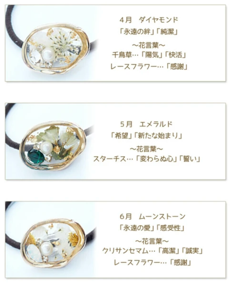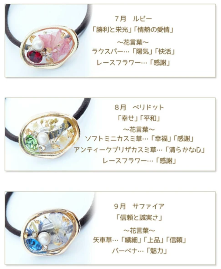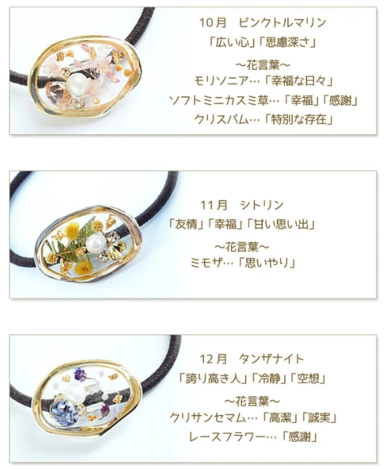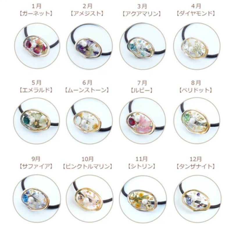 • Dried flowers and colorful birthstones are encased in resin to create a feminine look
