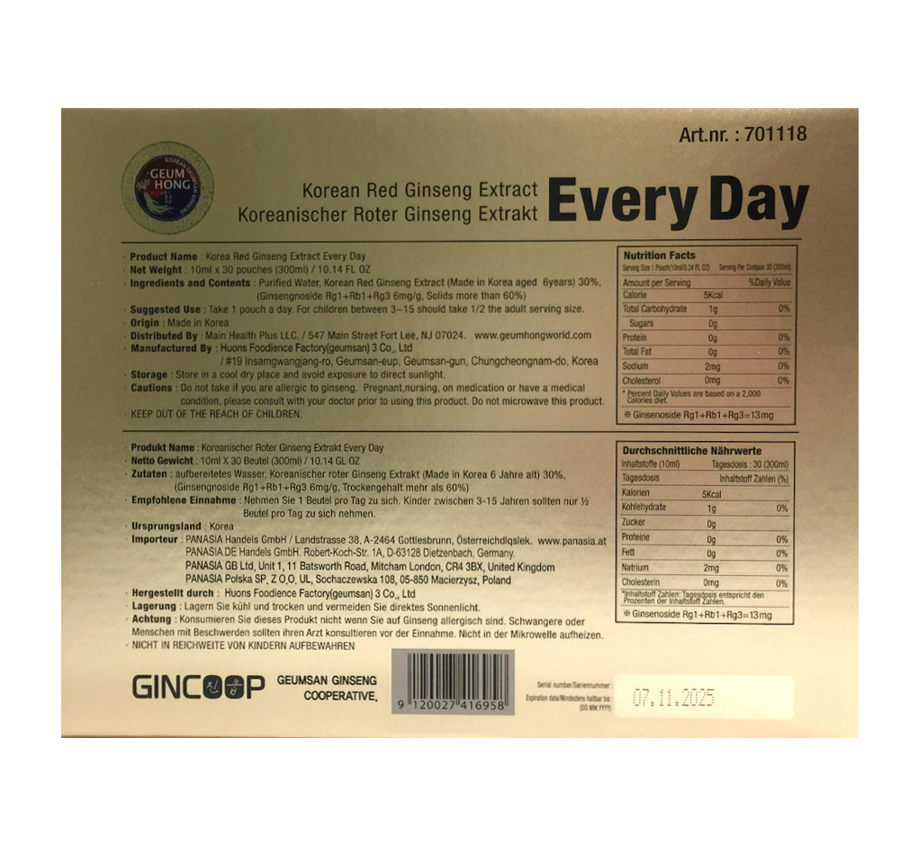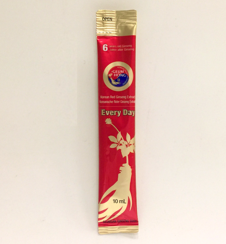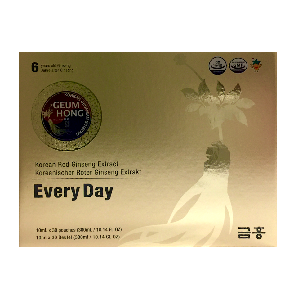 • 成分:纯净水、韩国6年生红参30% (G insenoside Rg1+Rb1+Rg3 6mg/g)